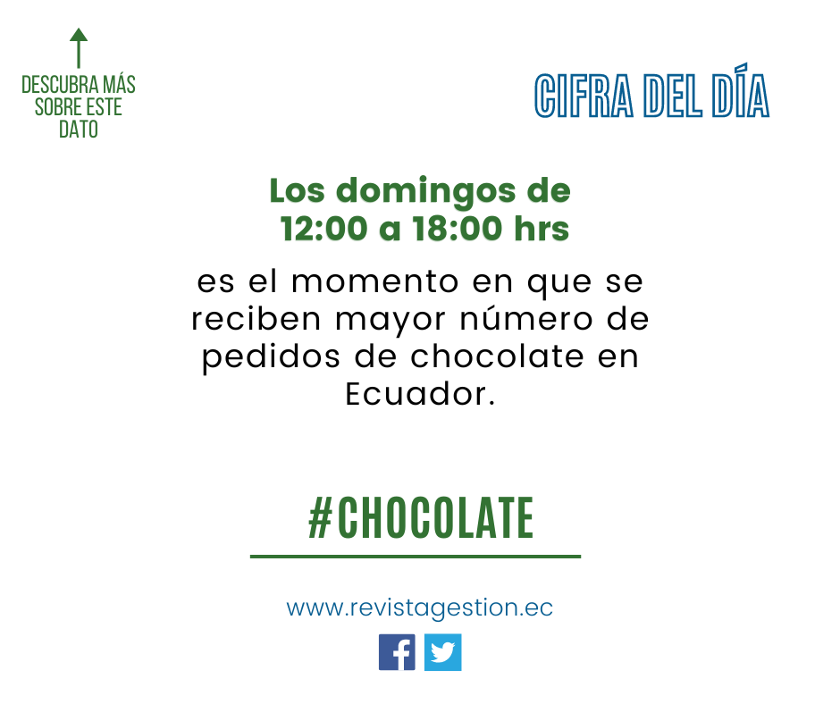 En Ecuador prefieren disfrutar de este alimento los fines de semana. Los domingos desde las 12:00 a las 18:00 hrs, es el momento en que se reciben mayor número de pedidos, que incluyen algún postre de chocolate, ya que son ideales para compartir una comida o almuerzo entre familia o amigos y sin duda, no es lo mismo si no se la acompaña con un buen postre.