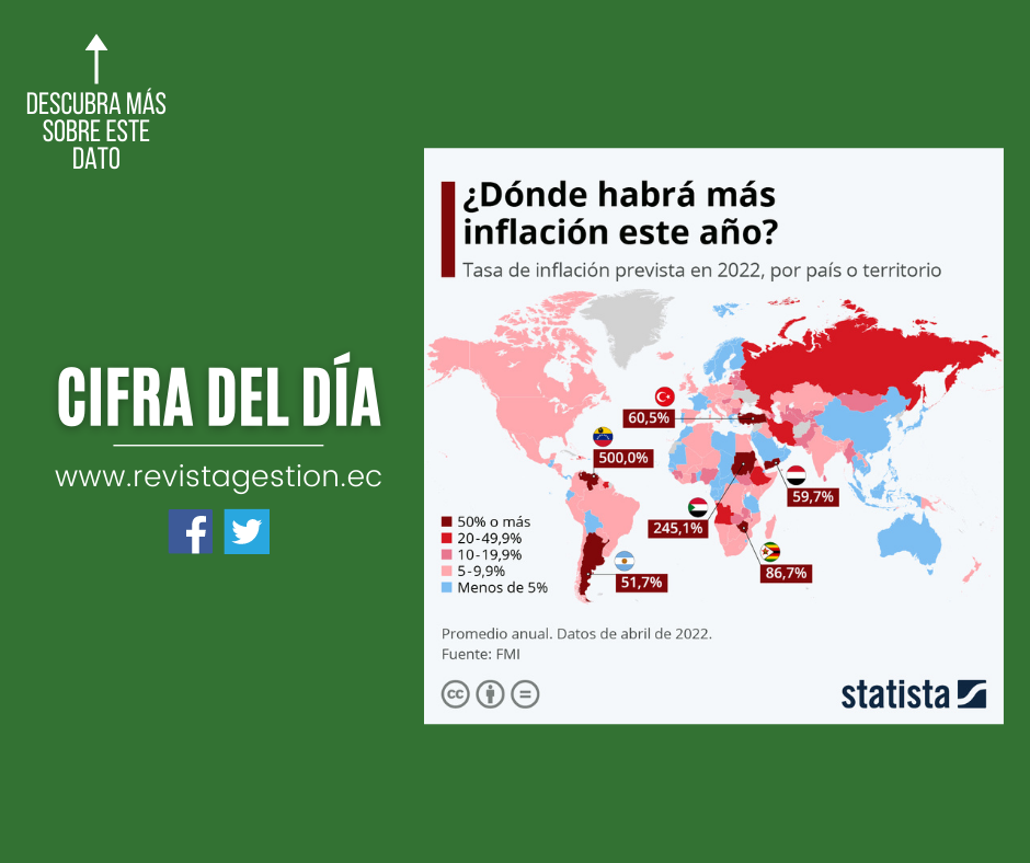 Como muestra este gráfico de Statista, ningún país del mundo tendrá más inflación que Venezuela este año, donde podría alcanzar un 500%. Sudán sería la segunda economía más afectada, con una tasa de más de 245%, seguida por Zimbabue (86,7%), Turquía (60,5%), Yemen (59,7%) y Argentina (51,7%). A Rusia, embarcarse en una guerra en su país vecino podría costarle un 21,3% de inflación en 2022, una de las más altas del mundo. En Estados Unidos, los precios podrían aumentar un promedio de 7,7% este año, casi el doble de lo registrado en 2021 y seis veces más que en 2020. A su vez, Japón y China ostentarían dos de las menores tasas de inflación en 2022, con tan sólo 1% y 2,1%, respectivamente.