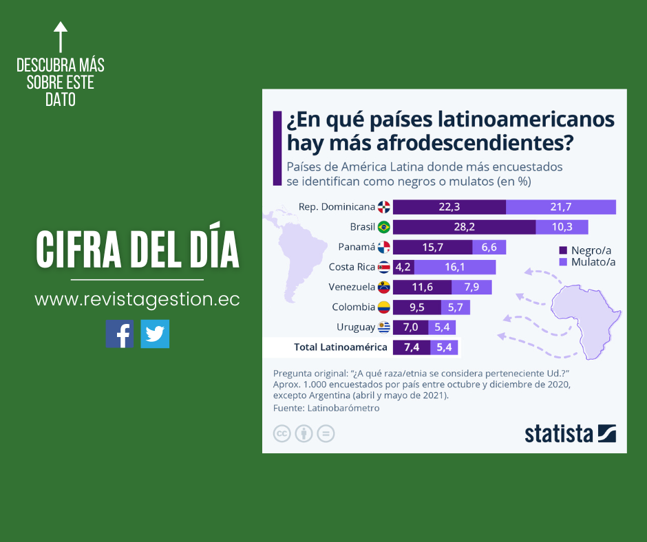 Según una encuesta de Latinobarómetro realizada en 19 países latinoamericanos en 2020 y 2021, República Dominicana es el país de la región donde más personas se definen como negras o mulatas, con un total del 44% de los encuestados. Si sólo tenemos en cuenta a los habitantes que se identifican como negros, entonces Brasil lidera en la región, con más del 28% de las respuestas. Otras de las naciones con mayor presencia de afrolatinos son Panamá, Costa Rica, Venezuela, Colombia y Uruguay.