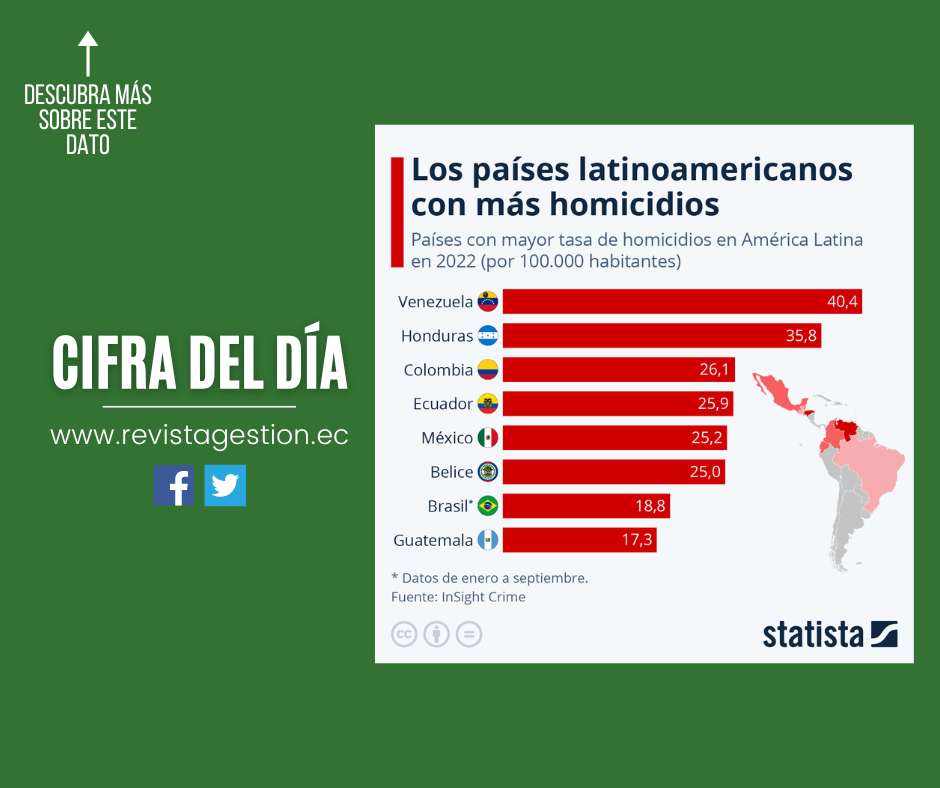 De acuerdo con datos proporcionados por la fundación de investigación sobre crimen organizado InSight Crime, Venezuela se destacó como el país de la región con la cifra más elevada de homicidios per cápita, con 40,4 casos por cada 100.000 personas. En el mismo año, Honduras ocupó el segundo lugar con una tasa de 35,8, seguido por Colombia con 26,1.