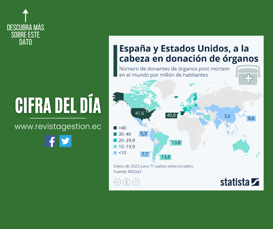Si murieras, ¿donarías tus órganos? De los 71 países analizados por el Registro Internacional de Donación y Trasplante de Órganos, España se encuentra entre los países a la cabeza: hay 40,8 donaciones por parte de fallecidos por cada millón de habitantes, una cifra sólo superada por Estados Unidos (41,6). En América Latina, por otra parte, las cifras son más bajas: en Brasil y Argentina, hay 13,8 donaciones por cada millón de habitantes. En Chile sólo 7,7 y en Colombia 5,3. China y Japón también tienen una tasa baja: 3,6 y 0,6 respectivamente.