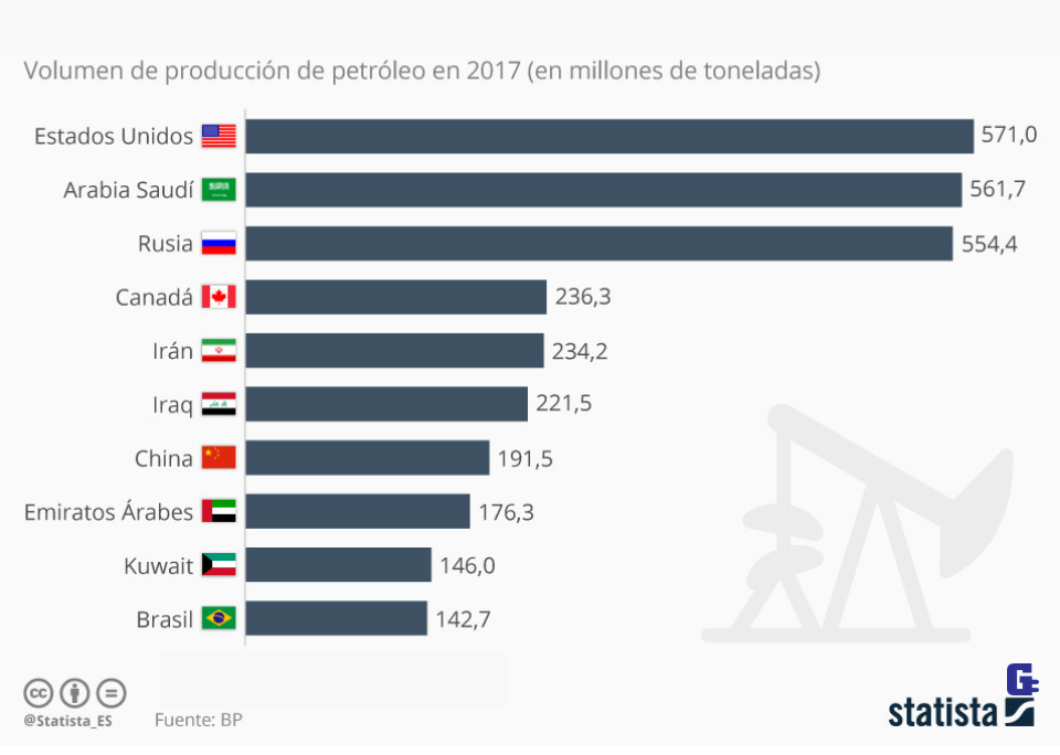 2018 comenzó con la noticia de que Estados Unidos, impulsado por el fracking, se había convirtió en 2017 en el mayor productor de petróleo del mundo, superando a Arabia Saudí. Tal y como muestra esta infografía de Statista, este produjo el pasado ejercicio 571 millones de toneladas, frente a 562 millones de los sauditas, según datos de BP.