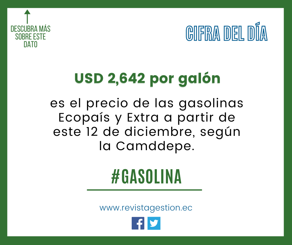 Según confirmó la Cámara Nacional de Distribuidores de Derivados de Petróleo (Camddepe), las gasolinas Ecopaís y Extra tendrán un precio de USD 2,642 por galón, desde las 00:00 del 12 de diciembre.