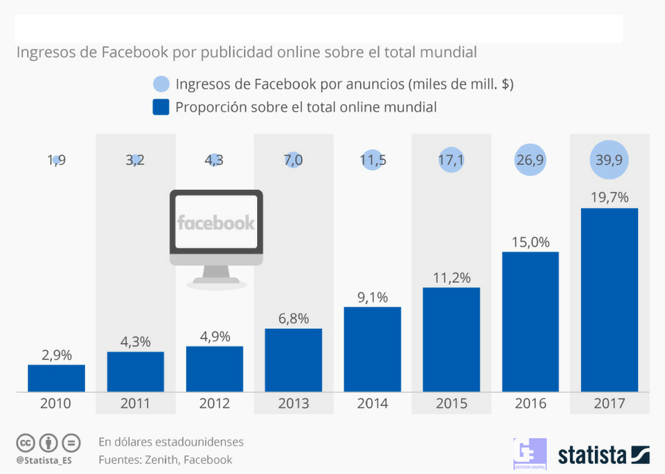 Tal y como se ve este gráfico de statista, gracias a la plataforma creada por Mark Zuckerberg, Facebook se ha convertido en una de las mayores empresas de publicidad online del mundo. Por ejemplo, en 2017, esta se embolsó aproximadamente el 19,7% del total de ingresos mundiales generados en este mercado, en base a estimaciones globales de Zenith. De hecho, en todo el mundo solo Google le supera en este segmento.