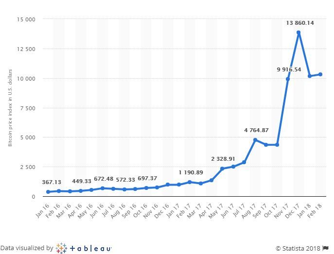 El gráfico presenta la evolución del índice de precios bitcoin desde enero de 2016 hasta febrero de 2018. El índice de precios de bitcoin es un promedio de precios en las principales bolsas mundiales. El valor del índice para finales de febrero de 2018 ascendió a $ 10,309.64 dólares estadounidenses.