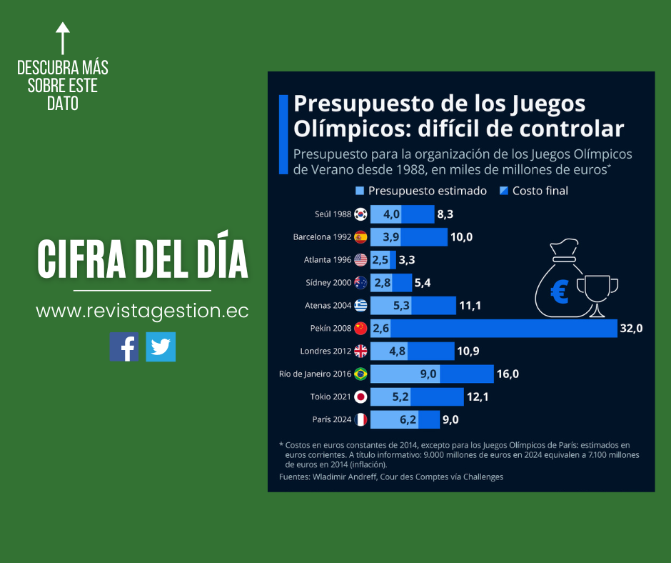 Como muestra nuestra infografía, desde 1988, el costo de los Juegos Olímpicos siempre se ha superado de media en más de un 100% —es decir, el doble (o más) de lo previsto—, con un sobrecosto récord en los Juegos de Pekín 2008, que costaron más de 30.000 millones de euros (+1100% respecto al presupuesto anunciado), debido principalmente al gasto masivo en construcción y modernización de infraestructuras.