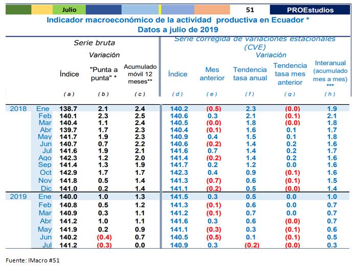 Periódicamente, ProEstudios publica el Business Survey Report (BSR), que consolida las principales variables macroeconómicas del país, de hecho, construye el Índice Macroeconómico de Actividad Productiva (IMACRO.ec) que supone un nuevo indicador para comprender el desarrollo productivo nacional. En la entrega número 21, correspondiente al mes de julio del 2019, se evidencia un estancamiento en la producción y es la primera vez en los últimos 20 meses. En serie bruta, el índice para julio de este año se coloca sobre los 141,2 puntos – similar al de abril de 2019- y en serie corregida decrece a los 140,9. El índice de julio es ligeramente mayor al presentado en junio pese al estancamiento de la producción, otros factores pueden influenciar dentro del desempeño económico como la Balanza Comercial o el gasto del Estado.