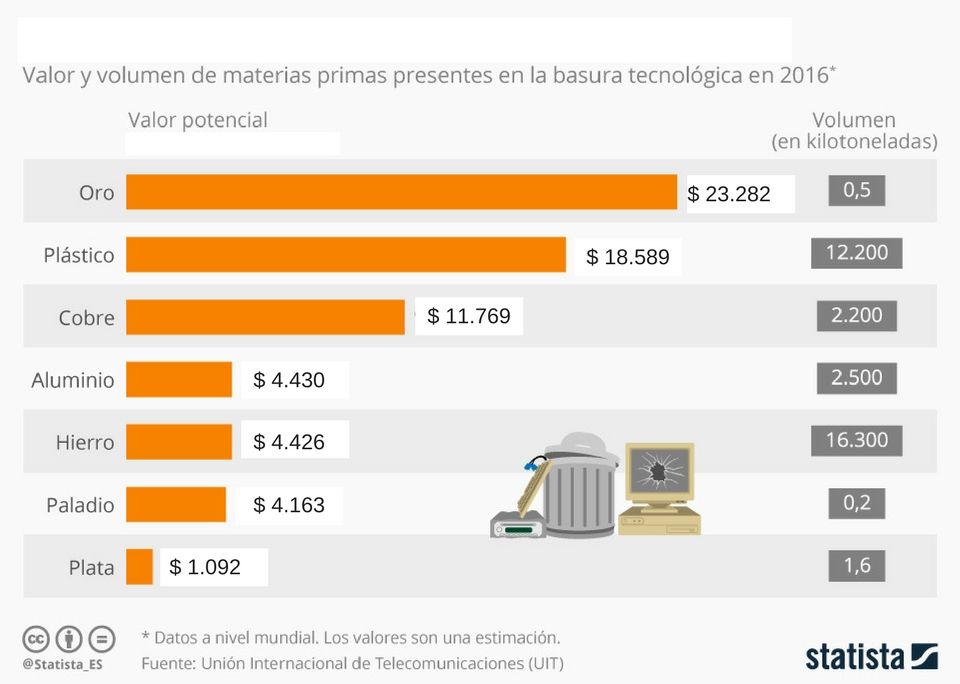 Como muestra esta infografía de Statista, realizada a partir de los datos publicados por la Unión Internacional de Telecomunicaciones (UIT), los desechos electrónicos registrados a nivel mundial durante 2016 contenían 500 toneladas métricas de oro. Si bien esta cantidad es muy inferior a la de otras materias primas tales como el plástico o el hierro, su valor se estimó en $ 23.282 millones. De esta forma, se convirtió en el material más valioso dentro de los que integran la basura tecnológica.