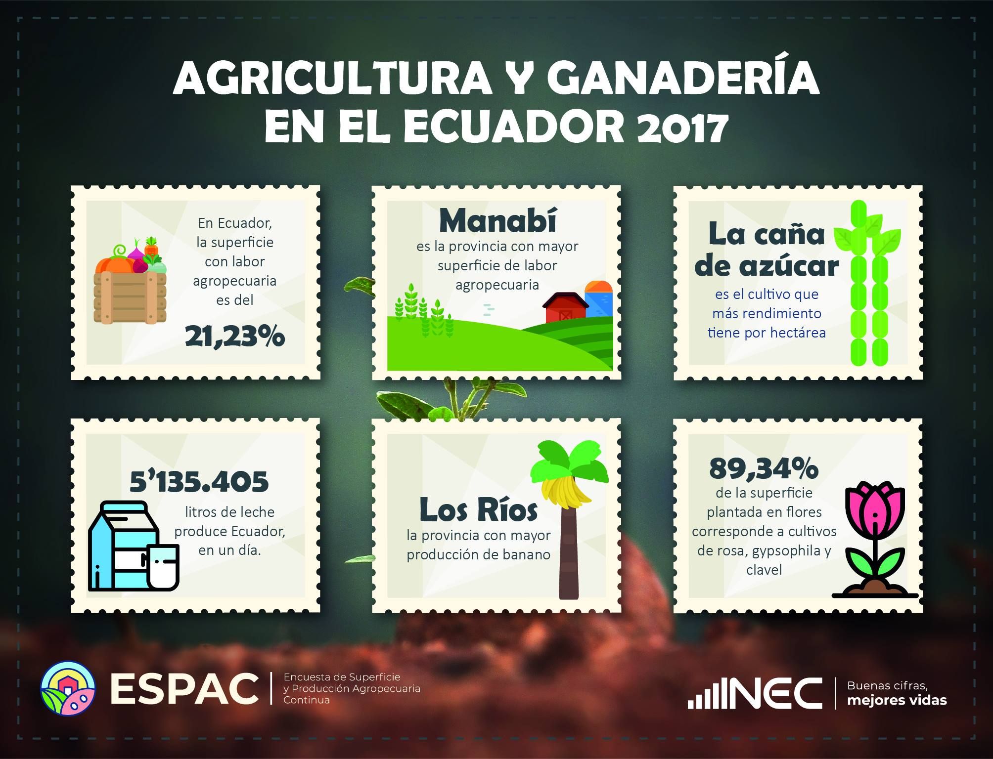Según la encuesta de Superficie y Producción Agropecuaria Continua (Espac) del INEC, la superficie de labor agropecuaria (cultivos permanentes, transitorios y barbecho, pastos naturales y cultivados) en el 2017 fue de 5,46 millones de hectáreas, la mayor superficie de suelo cultivable está destinada a pastos cultivados.