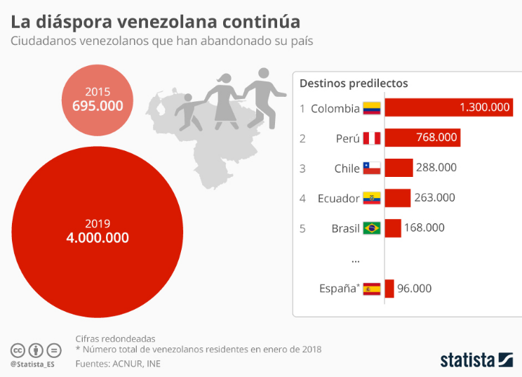 Los dos bloques enfrentados en el conflicto de Venezuela: el liderado por Nicolás Maduro y el encabezado por Juan Guaidó, se reunirán esta semana en Barbados para tratar de encontrar una solución al conflicto político. Estas conversaciones, impulsadas por el gobierno de Noruega, suceden días después de las denuncias por parte de la Alta Comisionada de Derechos Humanos de Naciones Unidas, Michelle Bachelet, sobre presuntos asesinatos a opositores perpetrados por el régimen chavista y las carencias alimenticias que sufre la población. Una de las pruebas más fehacientes de cómo Venezuela ya no reúne las condiciones para una vida a salvo es el número de ciudadanos que han abandonado el país. Según los últimos datos de la ONU al respecto, esa cifra ha alcanzado los cuatro millones de personas en junio de este año.