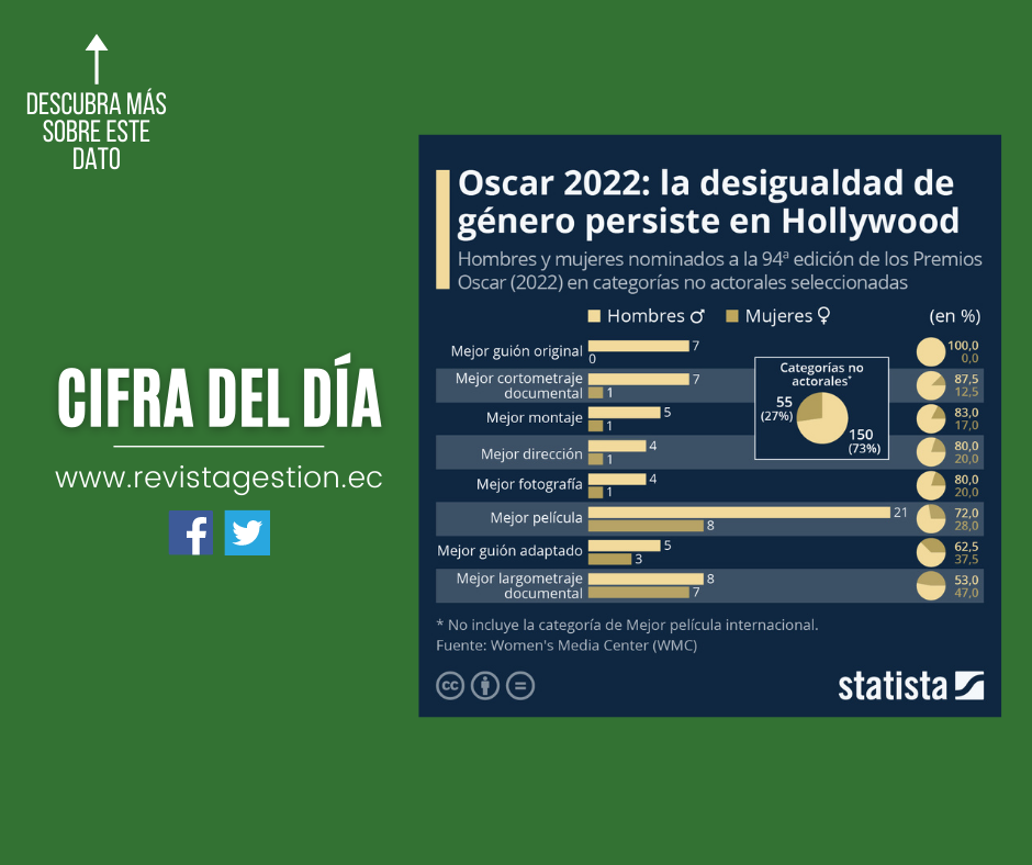 Según un estudio realizado por la organización Women’s Media Center, de los 205 nominados en 2022 en las categorías no actorales —excluyendo la de Mejor película internacional—, solo 55 (el 27%) son mujeres, mientras que 150 (el 73%) son hombres. Se trata de la tasa más baja de representación femenina en las 18 categorías no condicionadas por el género analizadas en tres años y un retroceso respecto a los modestos avances registrados en las dos ediciones anteriores (en 2021 la proporción de mujeres nominadas fue del 32%, y del 30% en 2020). El informe señala que este retroceso es “especialmente decepcionante teniendo en cuenta el esfuerzo de toda la industria para hacer cambios desde que los movimientos #MeToo/Time's Up ganaron prominencia en 2017-2018”.