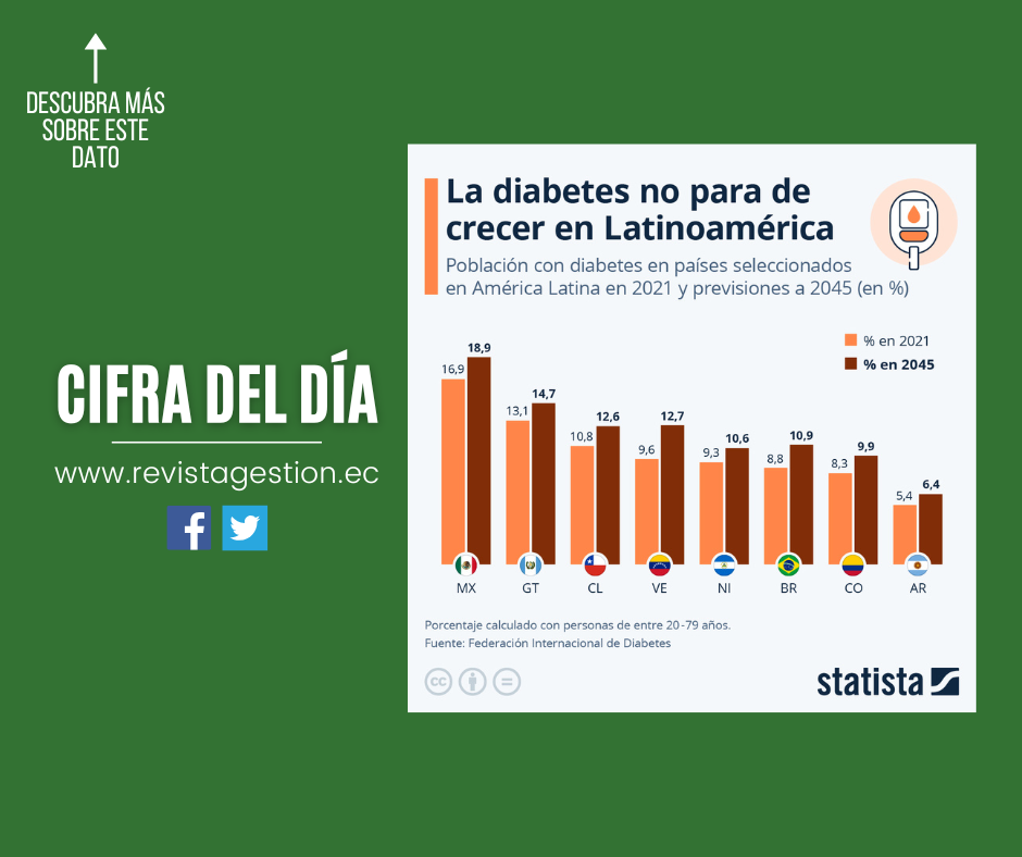 De acuerdo con la Federación Internacional de Diabetes, México es el país de América Latina con la mayor prevalencia de diabetes, afectando al 16,9% de su población en 2021, con una proyección de incremento del 18,9% para 2045. En contraste, Argentina registró el menor porcentaje de personas afectadas, con un 5,4% y una estimación de que esta cifra alcanzará al 6,4% de la población para 2045.