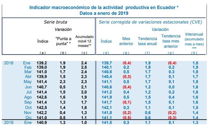 El Índice Macroeconómico de Actividad Productiva (IMACRO.ec), es realizado por PROEstudios y publicado periódicamente en el Business Survey Report (BSR). Para enero de 2019 se registró un aumento de 1% en las actividades productivas del país, utilizando una tasa interanual móvil acumulada (enero 2018-2019). En cuanto a las cifras corregidas por estacionalidad, el crecimiento es de 1,3%, menor al registrado en los últimos 12 meses. En la serie bruta, el índice se ubica en 140,9 puntos y en la serie corregida en 141,5.