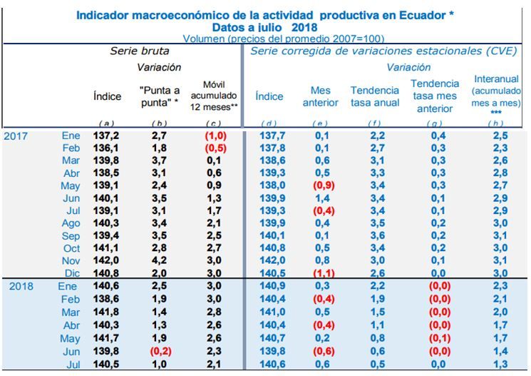 Los ajustes producidos en las cifras publicadas por el Banco Central del Ecuador también produjeron cambios en la serie del indicador macroeconómico de la actividad productiva, cuyos datos cambiaron desde 2017 hasta julio 2018. Actualmente, el índice se ubica en desaceleración bajo un escenario de inestabilidad de procesos para la formación de expectativas económicas y políticas.