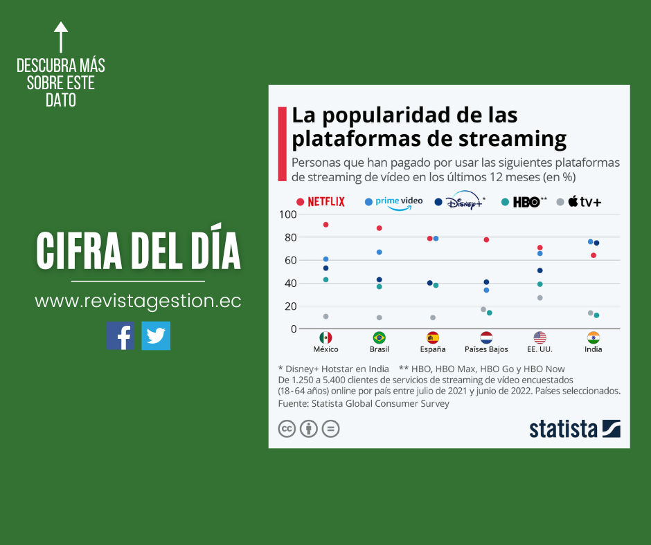 Aunque la plataforma estadounidense sigue siendo el líder mundial de los servicios de streaming, con cerca de 222 millones de suscriptores en el primer trimestre de este año, hay varios competidores que amenazan con quitarle participación de mercado. Amazon y el servicio de transmisión de Walt Disney lanzado en noviembre de 2019 son algunos de ellos, como vemos en el siguiente gráfico, elaborado a partir de los resultados de una encuesta llevada a cabo en distintos países en el marco del Statista Global Consumer Survey entre julio de 2021 y junio de 2022.