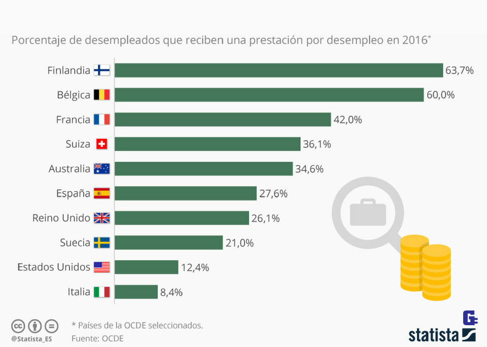 Según datos publicados recientemente por la OCDE, incluso en los Estados más avanzados económicamente, las ayudas por desempleo solo alcanzan a una minoría de desempleados respecto al total. Así, como se ve en este gráfico de Statista, en algunas potencias económicas tales como Suiza, Australia y Reino Unido, menos de la mitad de los desempleados reciben algún tipo de prestación. Algunos de los casos más extremos son Italia y Estados Unidos, donde menos de un 13% de ellos son beneficiarios de ayudas sociales. España ocupa un puesto intermedio en el ranking global de la organización, con un 27,6% de parados con prestaciones.