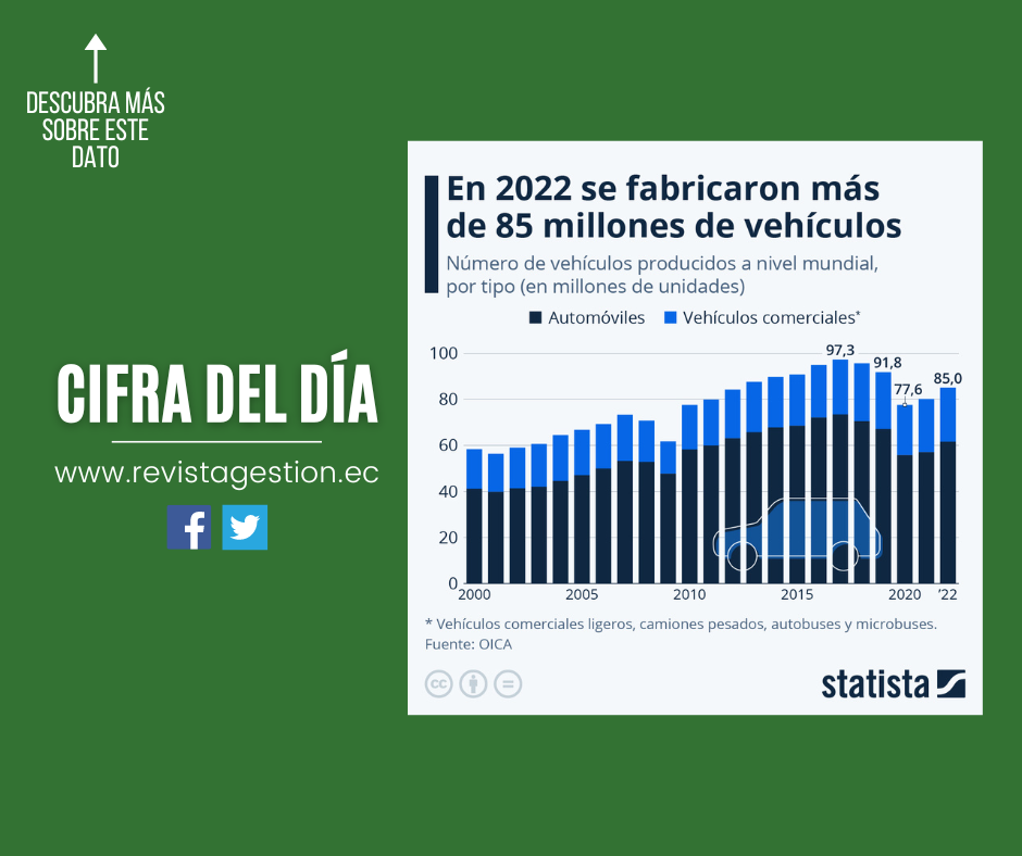 La fabricación mundial de vehículos, sumando automóviles y vehículos comerciales, alcanzó en 2022 los 85,02 millones de unidades, aumentando un 6% respecto al año anterior y acercándose a los niveles prepandemia, según los datos de la Organización Internacional de Constructores de Automóviles (OICA). Aunque esta cifra es mucho mejor que la del atroz 2020 (77,62 millones de unidades) está aún lejos del récord alcanzado en 2017, cuando las fábricas de todo el mundo produjeron 97,30 millones de vehículos.