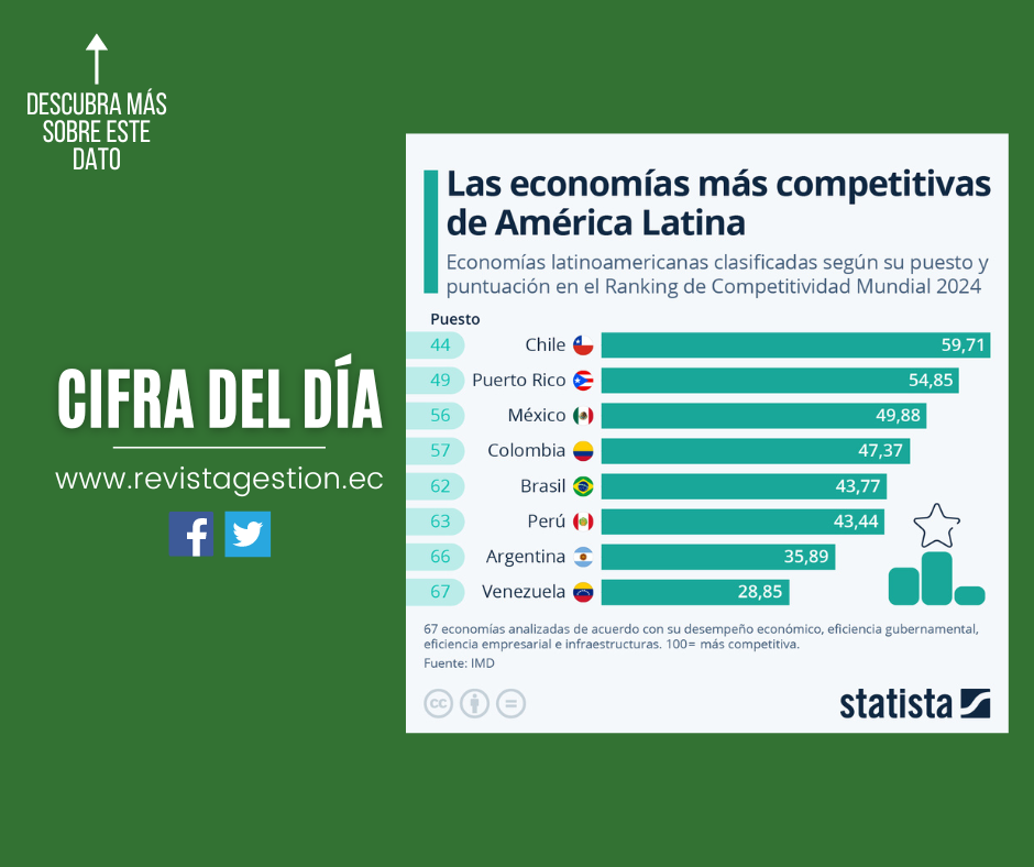 Tal y como muestra esta infografía de Statista, Chile se ubicó en esta edición en el puesto 44 de las 67 economías evaluadas, ocupando el puesto número uno en Latinoamérica con un puntaje de 59,71 sobre un máximo de 100 puntos.