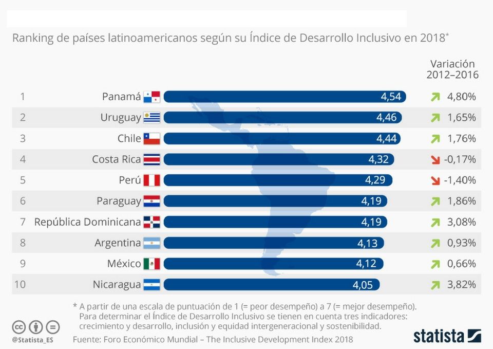 Latinoamérica está dominada por las economías emergentes. Pese a esta realidad, como muestra esta infografía de Statista, en los últimos cinco años algunos países han avanzado hacia un mayor crecimiento económico y una mayor inclusión social. En concreto, Panamá, que es la economía latinoamericana más sana con un IDI de 4,54 sobre 7, experimentó además el mayor crecimiento medio dentro de esta región: un 4,8% entre 2012 y 2016. Costa Rica y Perú, sin embargo, que se situaron en la cuarta y quinta posición respectivamente con un IDI de alrededor del 4,3, vieron como su resultado general disminuyó en los últimos cinco años. Esto se debió a una reducción de los ingresos netos y de las condiciones sanitarias de su población.