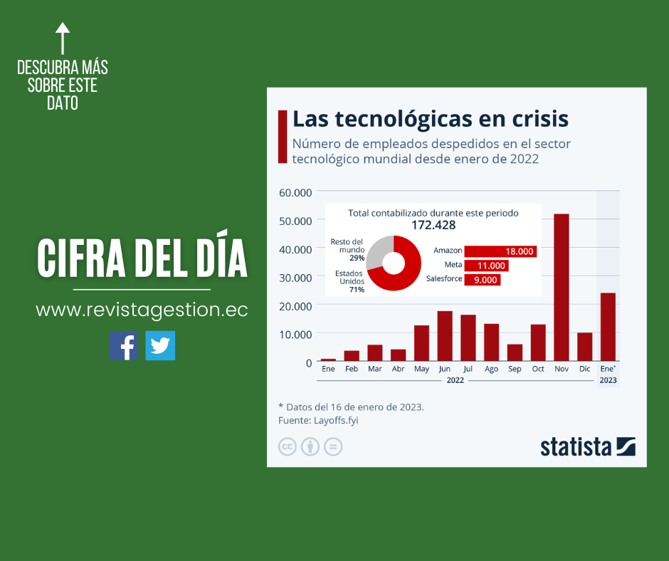 Los anuncios de planes de despidos masivos suceden sobre todo en Estados Unidos, donde los empleados están menos protegidos que en Europa en términos de legislación laboral y donde se han registrado más del 70% de las pérdidas de empleo en el sector. Las empresas que más empleos han recortado en el último año son Amazon (18.000), Meta (11.000, o el 13% de su plantilla), Salesforce (9.000) y Twitter (más de 7.000). Las empresas tecnológicas latinoamericanas han sido también afectadas por esta oleada de despidos, como muestra esta infografía de Statista.