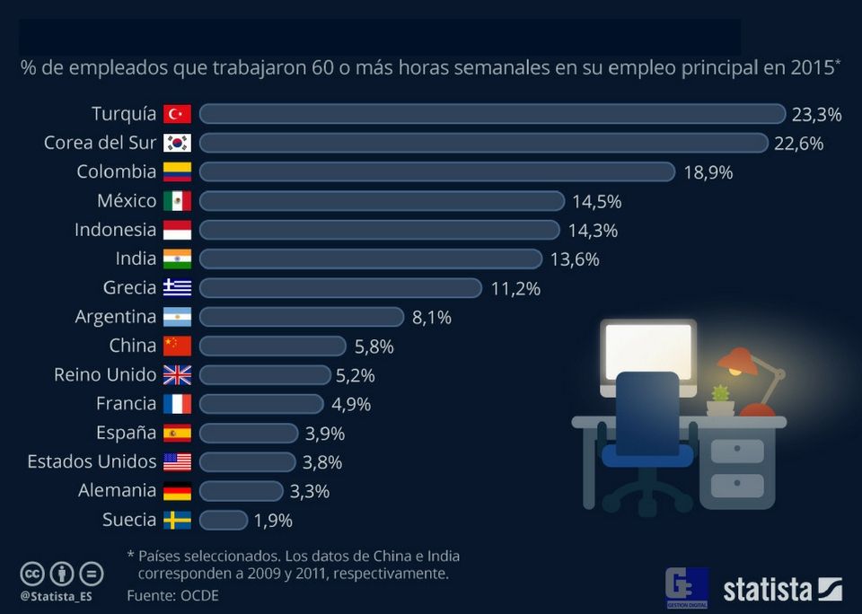 Como recoge esta infografía de Statista, y según datos facilitados por la OCDE, casi una cuarta parte de los turcos y surcoreanos trabajaron semanalmente 60 horas o más durante 2015. Una situación que no difiere demasiado de lo que ocurre en ciertos Estados de Latinoamérica, como es el caso de Colombia. Y es que, cerca del 19% de los trabajadores de este país sudamericano dedicó un mínimo de 60 horas a la semana en su empleo principal.