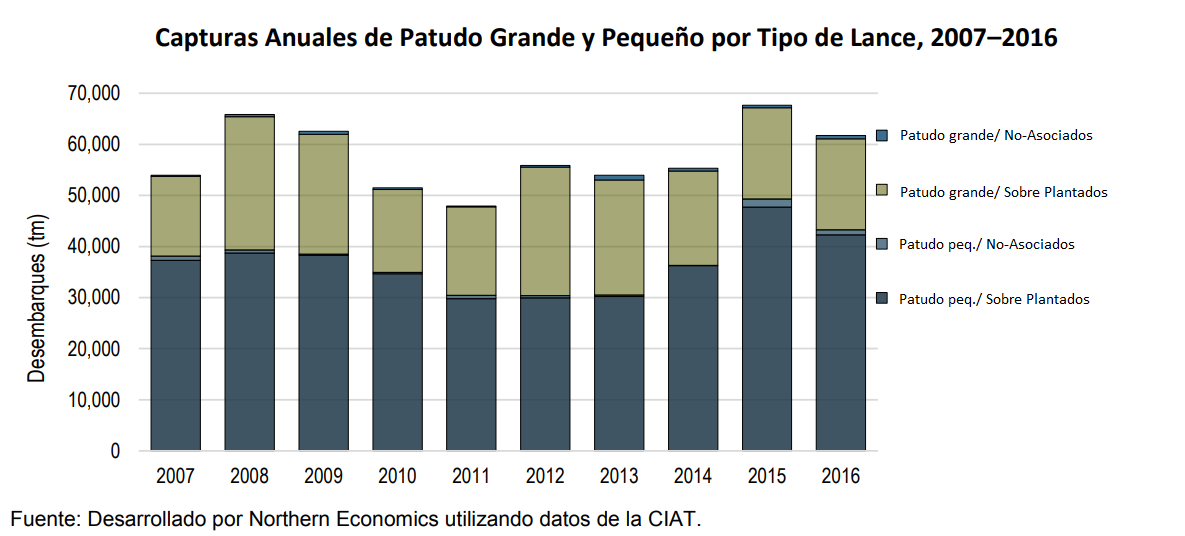 El gráfico muestra las capturas de patudos pequeños y grandes por tipo de lance entre 2007 y 2016. Se define como grandes a patudos con un peso de 15 kg o más, mientras que los patudos pequeños son aquellos animales con un peso inferior. La evidencia de la madurez sexual de estas especies proveniente de informes científicos y también indica que 15 kg es una línea razonable para distinguir entre peces que son sexualmente maduros y aquellos que probablemente no hayan alcanzado aún la madurez sexual.