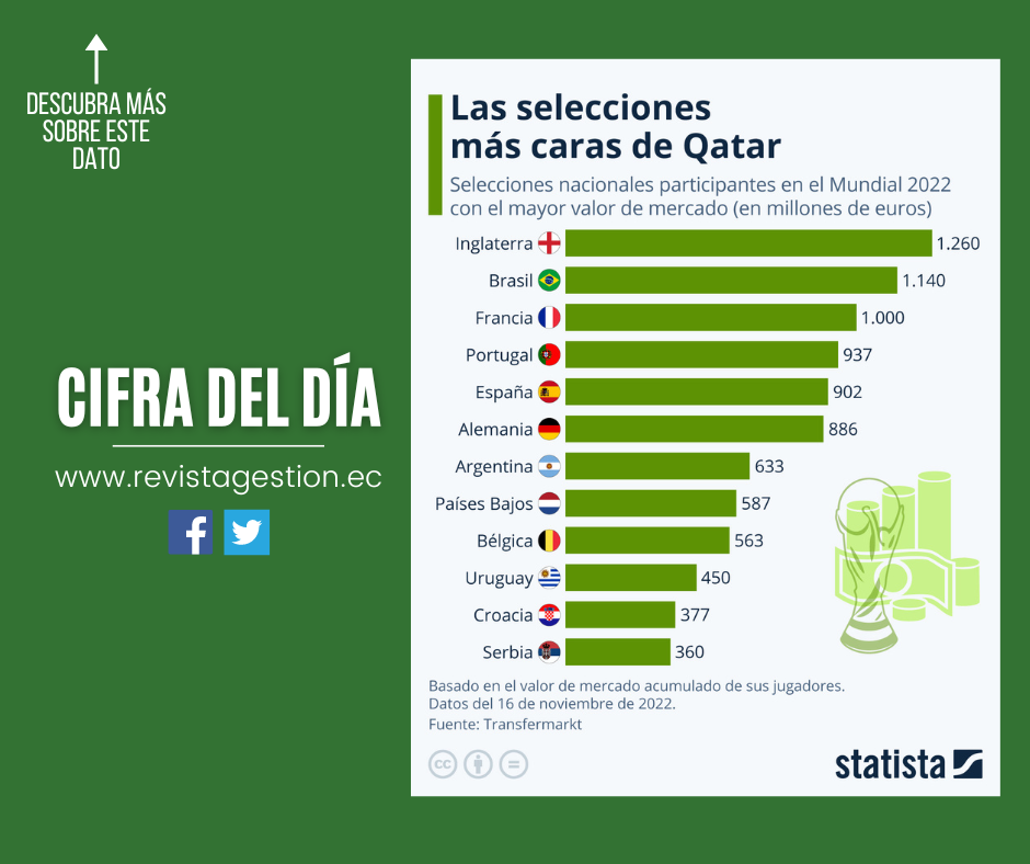 Tres países latinoamericanos se encuentran entre las diez selecciones con el mayor valor de mercado en la Copa Mundial de Qatar. Como es lógico, en primer lugar se ubica Brasil, cuyos jugadores hacen que su equipo esté valuado en más de 1.100 millones de euros. La selección argentina es la séptima a nivel global y segunda a nivel regional, con un plantel de alrededor de 633 millones, algo más de la mitad del de su vecino y tradicional rival futbolístico, Brasil. Quizá una de las sorpresas de este ranking sea la selección de Uruguay, que con el valor de 450 millones de euros, clasifica décima entre los equipos más caros que disputarán Qatar 2022.