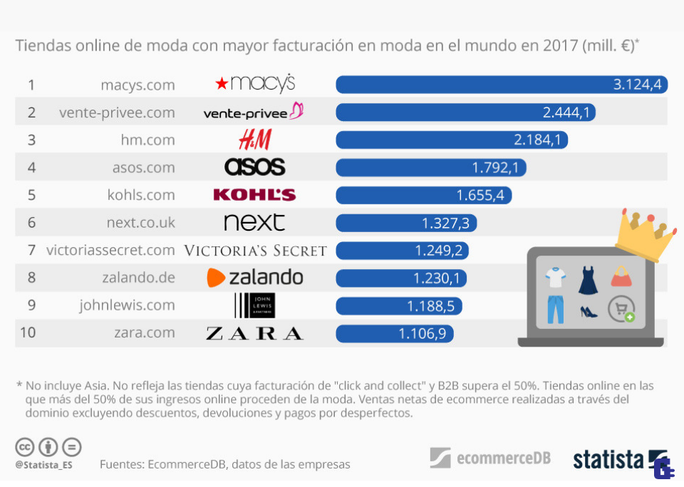 Según estimaciones de la página de información sobre comercio electrónico EcommerceDB, Macy's es la tienda online que vende artículos de moda por un mayor valor en el mundo, con alrededor de 3.124 millones de euros de facturación en 2017. A este le sigue en volumen de negocio en este segmento la página web francesa venteprivee.com, con 2.444 millones de euros, y la web del gigante sueco H&M (hm.com), con 2.184 millones de euros. Zara.com, que desde principios de mes comercializa sus productos online en prácticamente todo el mundo, ocupaba el año pasado la décima posición, con 1.107 millones de euros.