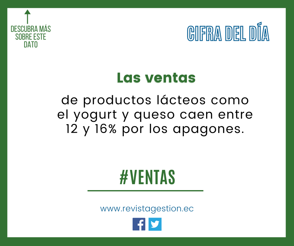Los apagones prolongados siguen generando pérdidas en el sector productivo. Pues de acuerdo a lo que indica a EXPRESO, Verónica Chávez Man-Ging, directora ejecutiva del Centro de la Industria Láctea del país, por los cortes de energía, en lo que va de este año las ventas del yogurt y del queso han caído entre el 12 y 16 %, en comparación a los primeros nueve meses del año pasado. Estos son los dos productos más afectados del sector ganadero.