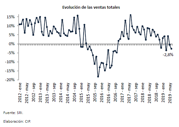 La Cámara de Industrias y Producción (CIP) emitió el análisis de ventas correspondiente al primer semestre de 2019, en el cual se destacan que estas alcanzaron los $ 62.400 millones, según el Servicio de Rentas Internas (SRI). El aumento, en comparación a enero- junio de 2018 tan solo fue de 0,65%, lo que muestra que no existe una evolución del sector comercial e industrial. En junio las ventas alcanzaron los $ 10.340 millones, evidenciando un decrecimiento mensual de -5,2%, y una variación anual de 2,8%; lo que significa que se comercializó menos que mayo 2019, pero más que junio 2018 (Gráfico).