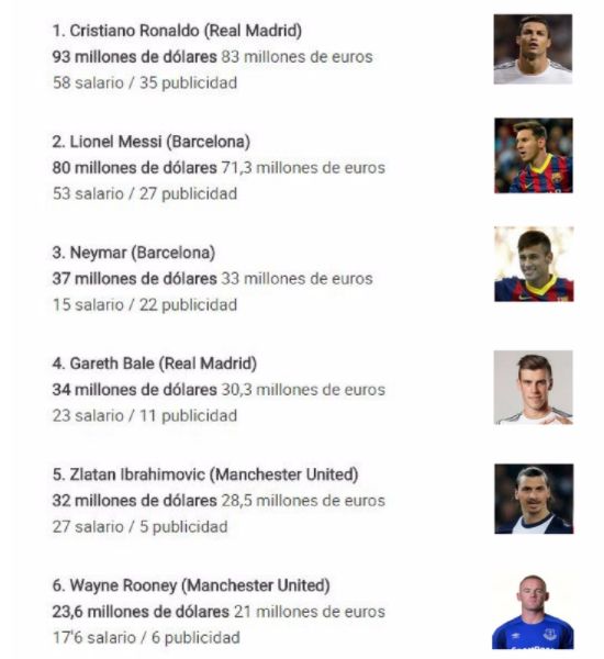 La revista Forbes publicó la lista de futbolistas mejor pagados en el mundo. Los ingresos de los futbolistas profesionales se dividen en el salario que les pagan los clubes y los beneficios que obtienen de contratos de publicidad.