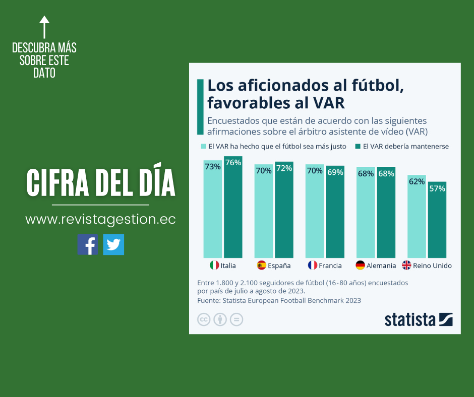 Según los datos de la encuesta Statista European Football Benchmark, la mayoría de los aficionados al fútbol de Alemania, Francia, Italia, España y el Reino Unido están a favor de mantener el VAR, y afirman que tiene un efecto positivo en el fútbol, haciendo que el juego sea más justo. Mientras que los aficionados italianos están mayoritariamente a favor del VAR, los encuestados británicos se muestran ligeramente más escépticos al respecto. Sin embargo, incluso en el Reino Unido, el 57% de los encuestados está a favor de mantenerlo, frente a sólo un 12% que quiere abandonarlo y un 26% que aún está indeciso.