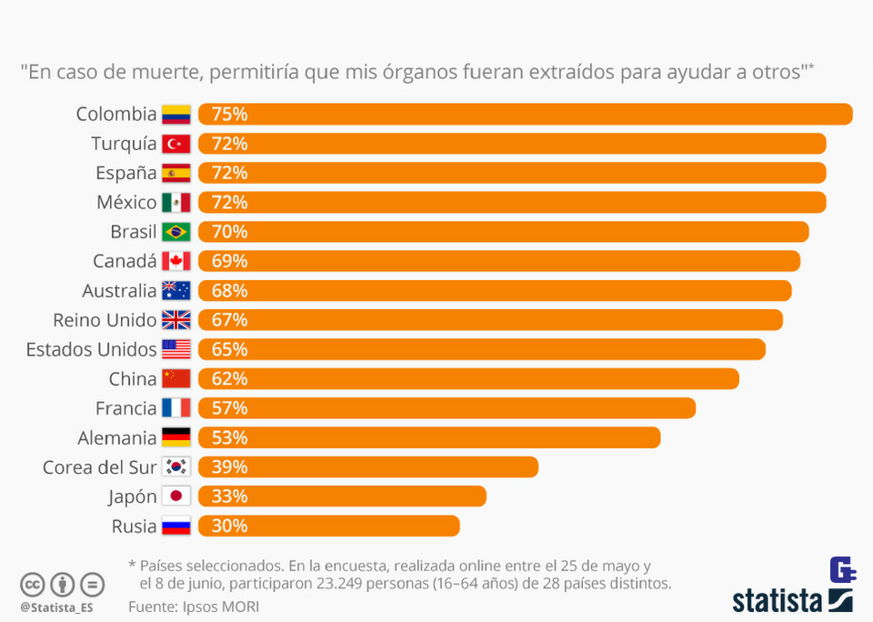 Mientras que para algunos la donación de órganos 'post mortem' supone una obra caritativa en la que el debate deontológico no plantea muchos problemas, otras culturas sí se muestran más reticentes a ella. Por ejemplo, tal y como recoge este gráfico de Statista, parece que los países de idiomas latinos están en general a favor de que sus órganos sean trasplantados a otras personas una vez fallecidos.