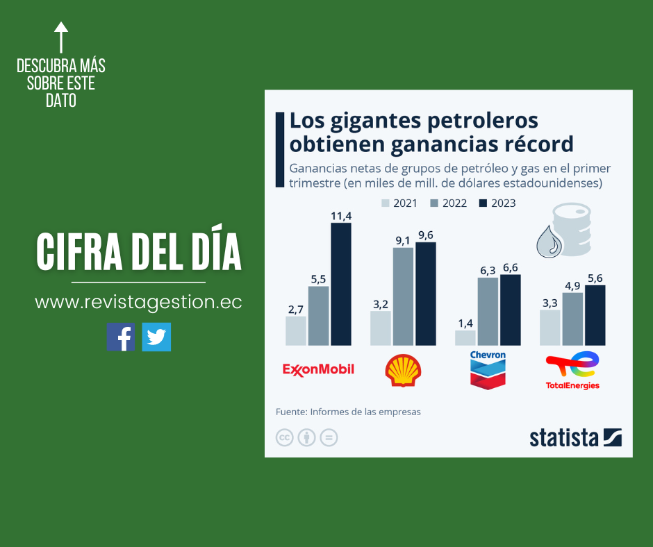 El grupo estadounidense ExxonMobil obtuvo un beneficio neto de 11.400 millones de dólares en los tres primeros meses de 2023, algo más del doble de los 5.500 millones del primer trimestre de 2022. El gigante energético francés TotalEnergies, por su parte, registró un beneficio neto trimestral de 5.600 millones de dólares, lo que supone un aumento del 14% con respecto al mismo periodo del ejercicio precedente. La empresa anglo-holandesa Shell y la estadounidense Chevron vieron aumentar sus ganancias en torno a un 5% interanual, hasta los 9.600 y 6.600 millones de dólares, respectivamente.