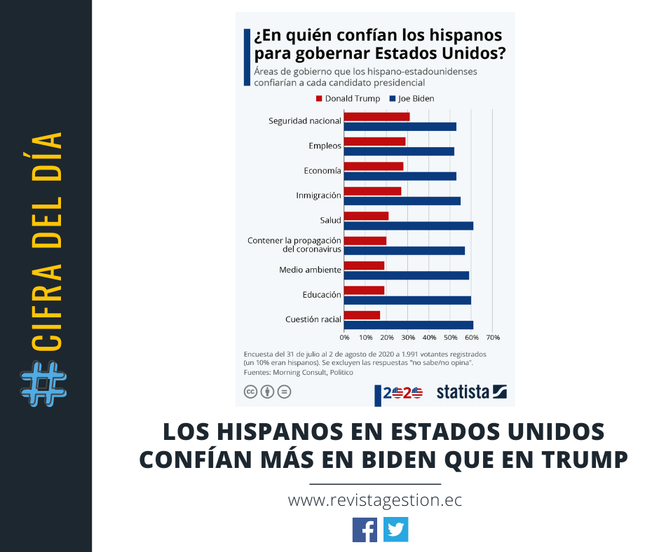 Asimismo, ante la pregunta acerca de a quién encomendarían la contención del brote de COVID-19 en su país, Joe Biden registra un nivel de confianza del 57% en la población hispana, 37 puntos porcentuales más que su rival republicano. De las carteras de gobierno incluidas en este gráfico de Statista, Trump sólo pudo superar el 30% de apoyo hispano en el ámbito de la seguridad nacional.