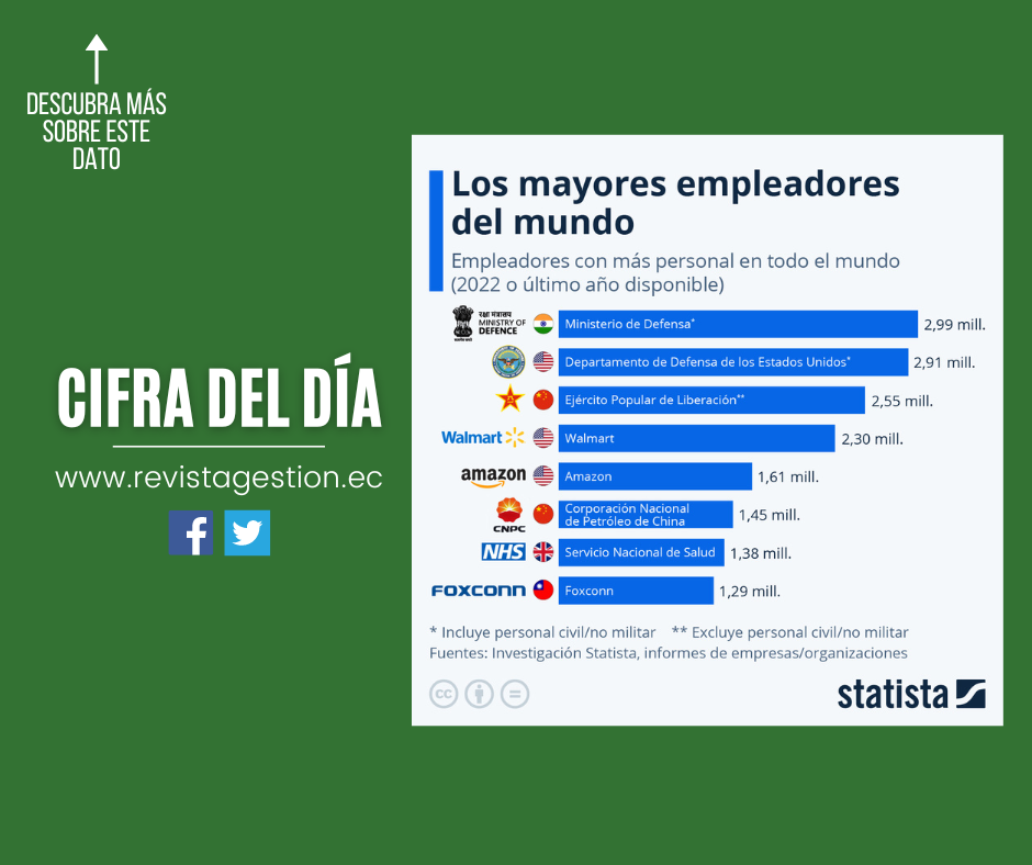 Ninguna empresa del mundo tiene más empleados que Walmart. Los últimos datos del gigante minorista estadounidense sitúan la cifra en nada menos que 2,3 millones. Ni siquiera Amazon, el gigante del comercio electrónico, se le acerca, a pesar de estar en segundo lugar con una plantilla de 1,6 millones de trabajadores. Sin embargo, como muestra esta infografía, hay un sector que aparentemente necesita aún más mano de obra que el comercio minorista, y es el de la defensa.