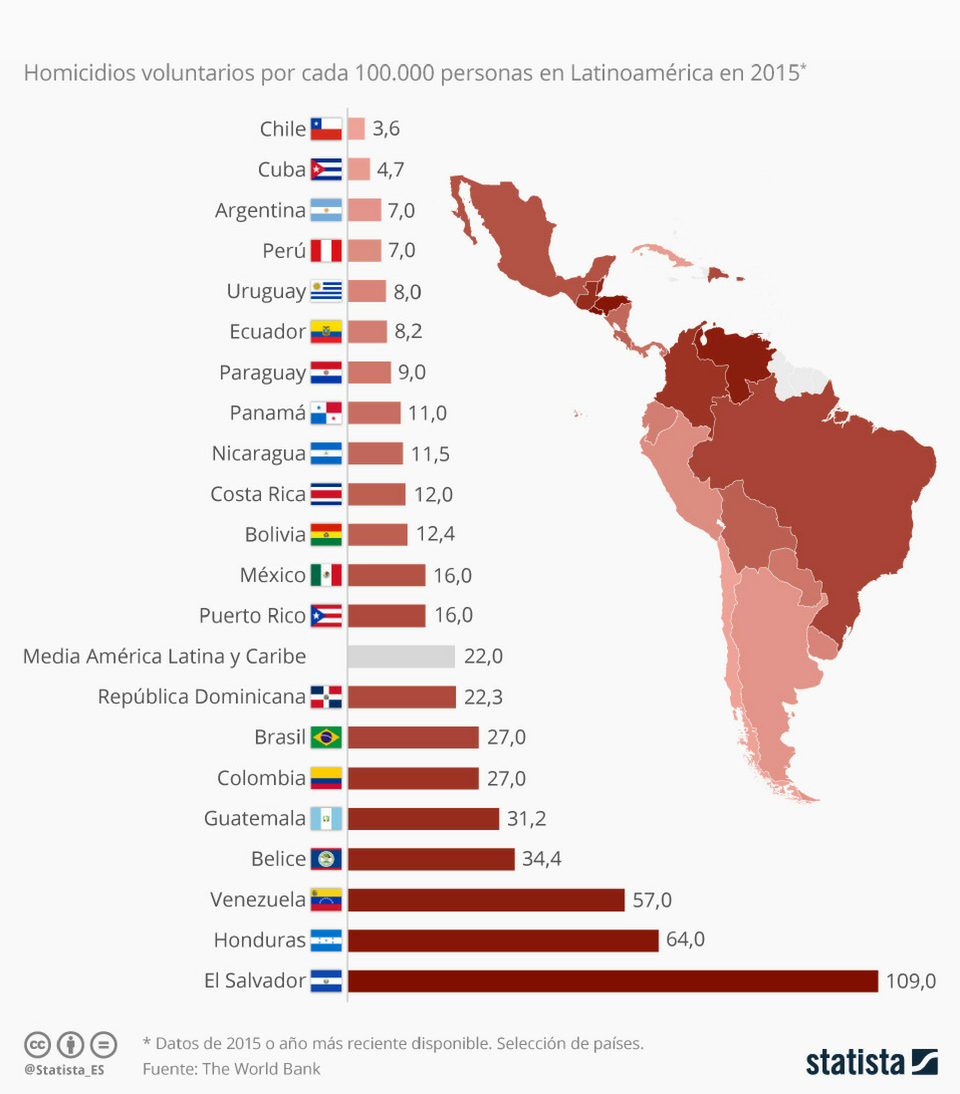 Aunque el homicidio voluntario es solo uno dentro de la gran variedad de delitos tipificados existentes, su prevalencia se puede utilizar como un indicador sobre el nivel de seguridad de los diferentes países del mundo. Como muestra esta infografía de Statista, usando el ratio de homicidios como baremo, se puede afirmar que la diferencia en peligrosidad entre unos países y otros de Latinoamérica es muy amplia.