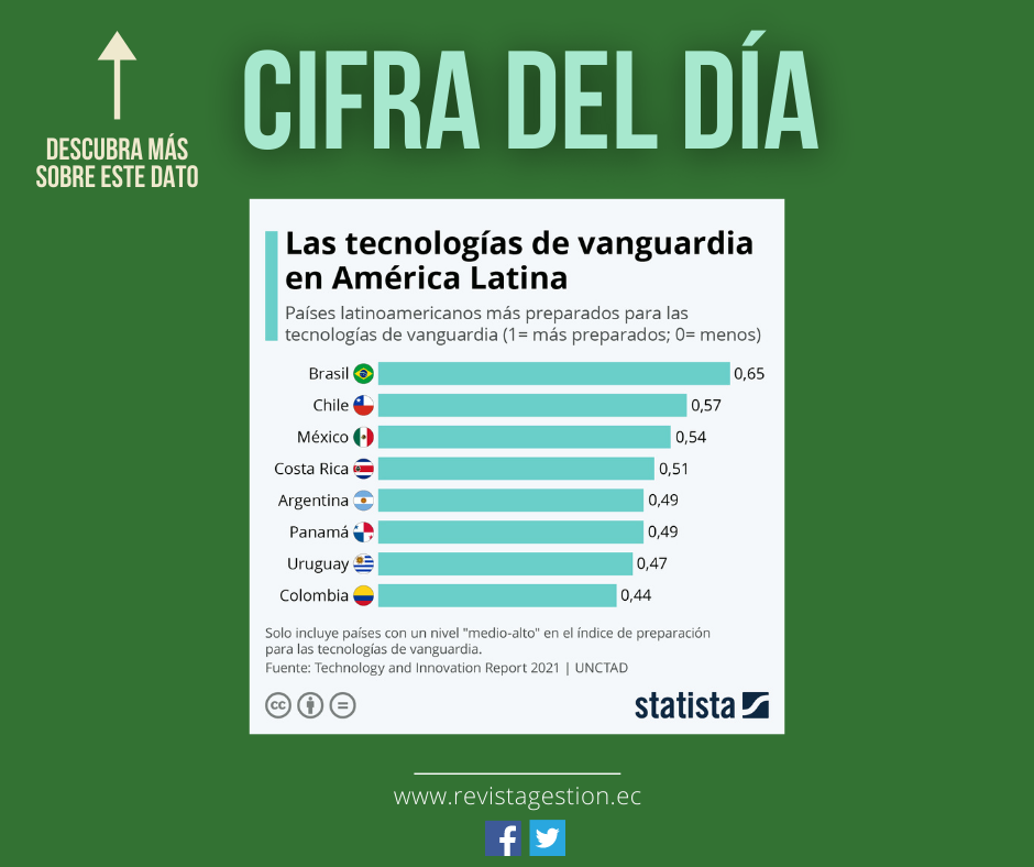 Aún así, algunos países latinoamericanos muestran aptitudes destacadas en el ámbito de las tecnologías de vanguardia o de frontera. Dentro de esta denominación, se incluye a las áreas de big data, Blockchain, Internet de las Cosas (IoT), la robótica, la 5G, la energía solar fotovoltaica, la impresión 3D, la edición genómica, los drones y la nanotecnología. Según un estudio recientemente publicado por la UNCTAD, Brasil es la economía latinoamericana que se encuentra mejor preparada para el arribo de estas tecnologías, con un índice de preparación del 0,65, de un máximo de uno. Chile, México y Costa Rica también alcanzan un nivel medio-alto de preparación, los tres con un puntaje superior al 0,5. Las ocho naciones incluidas en este gráfico de Statista son las más preparadas de la región, todas ellas alcanzando o superando la media global, que se ubica en un 0,44.