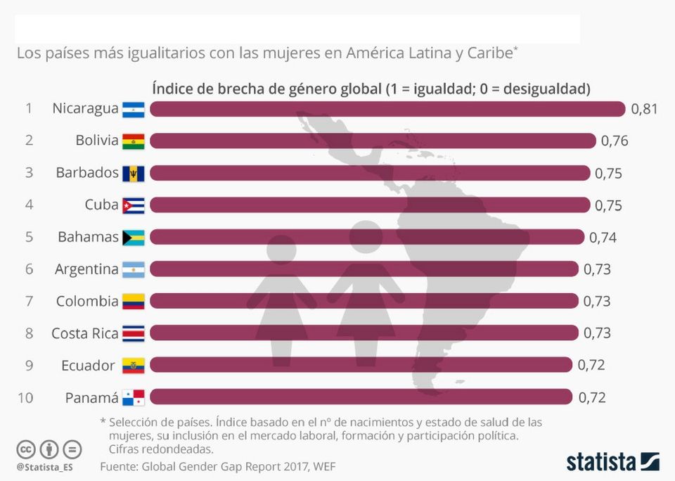 Nicaragua es el Estado de la región de América Latina y Caribe en el que las mujeres son tratadas con un mayor grado de igualdad, según el Global Gender Gap Report de 2017, elaborado por el World Economic Forum. Al país centroamericano, que obtiene 0,81 puntos sobre un total de 1 en el 'Índice de brecha de género global', en el que se basa la clasificación. De 10 países que se muestran en este gráfico, Ecuador se encuentra con un puntaje de 0,72 junto con Panamá. Por otro lado, los Estados en los que las féminas se encuentran más excluidas de la sociedad y economía son Guatemala, Paraguay y Brasil, con una puntuación menor a 0,69 puntos en los tres casos, tal y como recoge la fuente original de los datos mostrados en este gráfico de Statista.