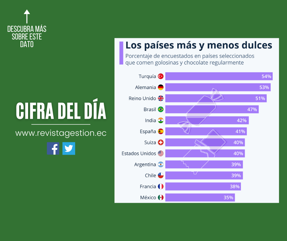 En Suiza, país famoso por su chocolate, cuatro de cada diez encuestados afirman consumir este producto de manera regular y un porcentaje parecido se registra en España. De los países seleccionados en este gráfico, dos asiáticos están entre los más aversos al consumo regular de golosinas y chocolate: en China el 25% de los encuestados afirma hacerlo y en Corea del Sur apenas lo hace un 14%. De los países latinoamericanos presentes en este gráfico, ninguno supera a Brasil en cuanto a la afición por el dulce, con un 47%. Le siguen Argentina (39%), Chile (39%) y, por último, México (35%).