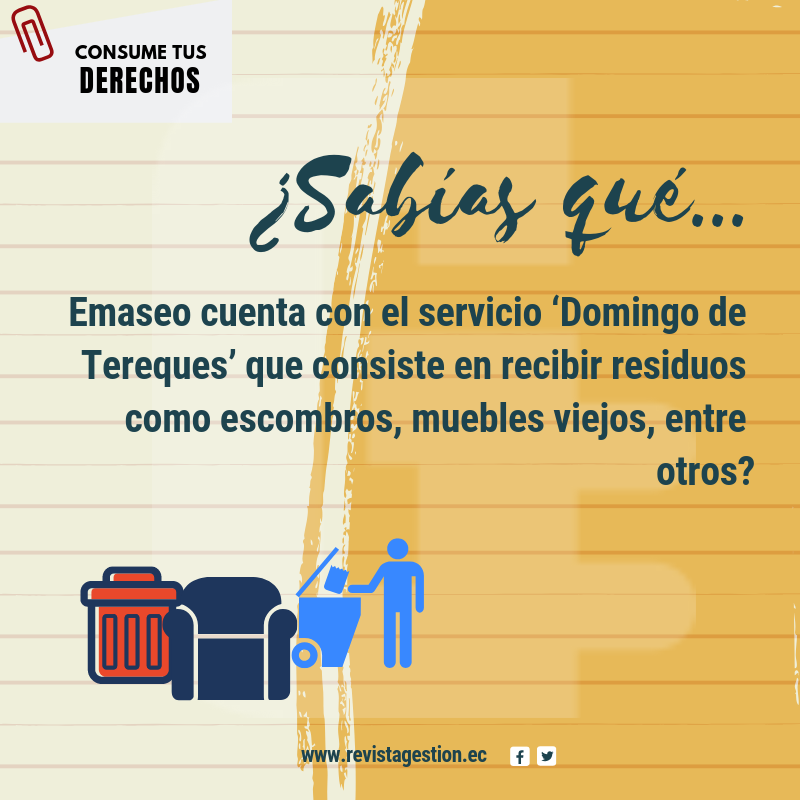 Es por esto que Emaseo cuenta con el servicio ‘Domingo de Tereques’ que consiste en recibir estos residuos. El servicio lo brinda de forma gratuita a todos los ciudadanos del Distrito Metropolitano de Quito, todos los domingos de cada mes. El objetivo de este servicio es que no se depositen estos residuos en las calles, avenidas o terrenos de la ciudad y se mantenga la limpieza de Quito.
