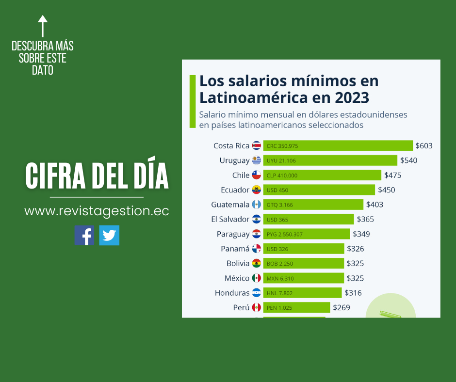 De los países analizados en esta infografía de Statista, Costa Rica cuenta con el salario mínimo más alto, que totaliza unos 603 dólares por mes en enero de 2023. Otros de los países latinoamericanos que garantizan un nivel de ingresos relativamente alto a los trabajadores son Uruguay, cuyo salario mínimo supera los 21.100 pesos uruguayos (unos 540 dólares por mes), y Chile, donde alcanza los 410.000 pesos chilenos (alrededor de 475 dólares mensuales). En Colombia rige un piso salarial de 1.160.000 pesos colombianos, lo que equivale a unos 242 dólares, mientras que en Argentina la conversión del salario mínimo de 65.427 pesos argentinos a la moneda estadounidense arroja tan sólo unos 189 dólares.