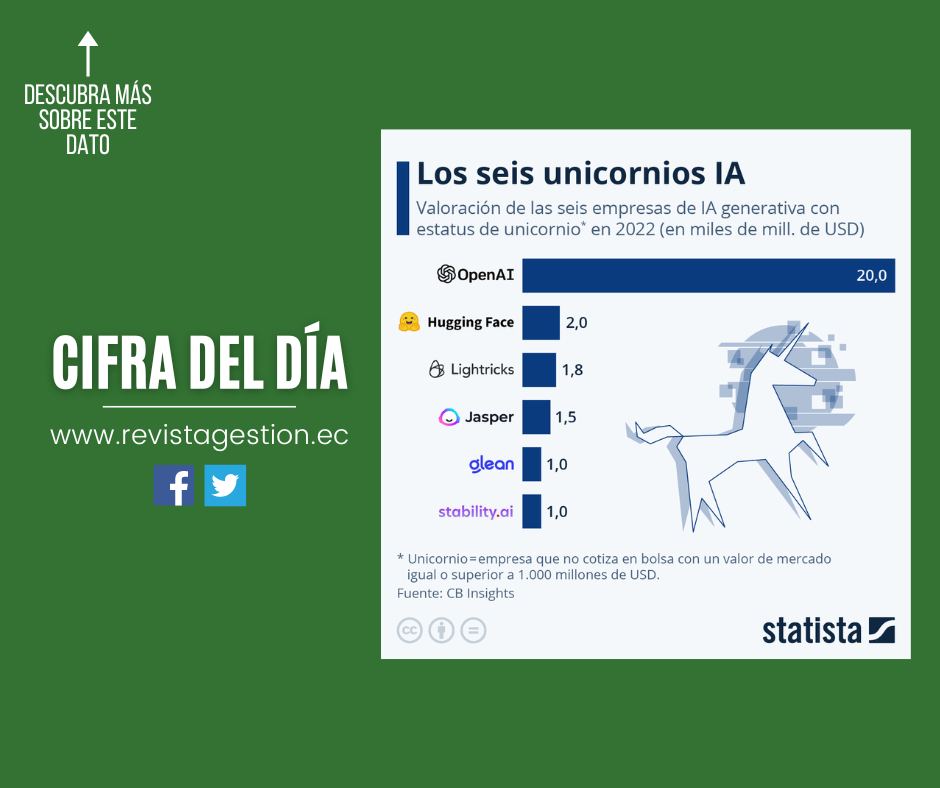 La inteligencia artificial generativa es una rama de la IA cuyo enfoque y objetivo es la generación de contenidos originales a partir de datos. La empresa más conocida en este ámbito es actualmente OpenAI, creadora de ChatGPT. La plataforma de análisis empresarial CB Insights estima el valor de la empresa californiana en unos 20.000 millones de dólares.