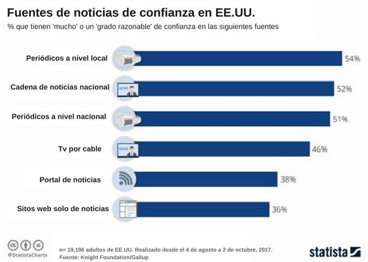 Durante un período sin precedentes de escrutinio y crítica, los medios de comunicación en EE.UU. están tratando con un público cada vez más escéptico. Según una reciente encuesta de Gallup para la Fundación Knight, el pueblo estadounidense pone más confianza en los periódicos locales, pero incluso así, sólo el 54% dicen tener 'mucha' o un 'grado razonable' de confianza en ellos.
