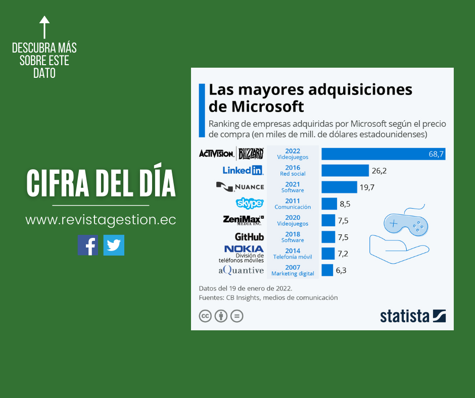 Como muestra la siguiente infografía, en las dos últimas décadas, Microsoft ha realizado adquisiciones en diversos ámbitos que van desde la telefonía móvil (Nokia) hasta las plataformas de desarrollo de software (GitHub) y las redes sociales (LinkedIn).