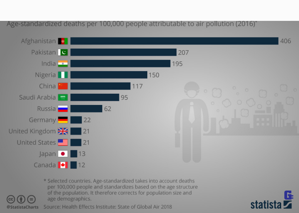 Aunque la India y China cuentan con la mayor cantidad de muertes causadas por contaminación del aire en todo el mundo, con 1,61 y 1,58 millones, respectivamente, las estadísticas pintan una imagen distinta cuando se trata de muertes estandarizadas por cada 100.000 habitantes. En 2016, Afganistán contaba con una mayor tasa de mortalidad por 100.000 habitantes que la India. De hecho, hoy el aire contaminado tiene más probabilidades de dañar a los afganos que los ataques de los insurgentes o ataques aéreos. En Kabul, madera y plástico se queman en generadores que expulsan humo.