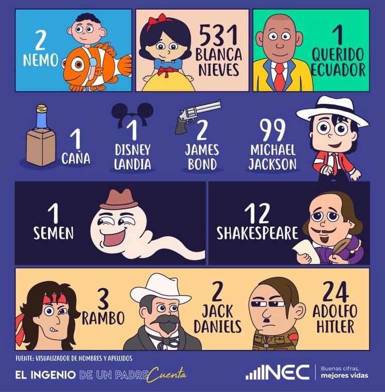 También hay 12 Shakespeare, 24 Adolfo Hitler y 531 Blanca Nieves, según una base de datos del Inec que cuenta con información desde 1800.