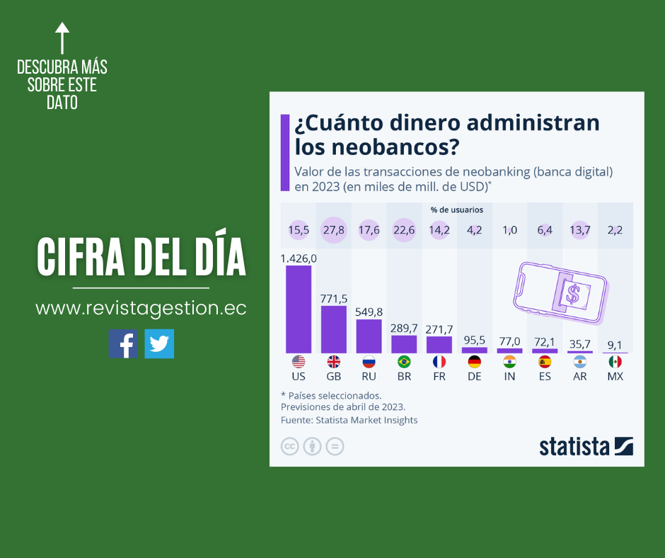 Según datos del Statista Market Insights, se estima que el valor de las transacciones en el segmento del neobanking en Estados Unidos alcance aproximadamente 1,43 billones de dólares en 2023, gracias a que un 15,5% de su población utiliza la banca online. Entretanto, al sur del continente, se espera que Brasil alcance una tasa de penetración del 22,6%, moviendo casi 290.000 millones de dólares en transacciones.