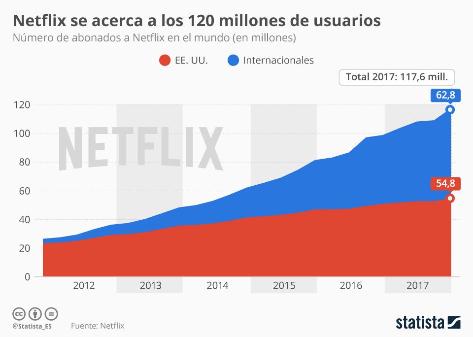 Como muestra esta infografía de Statista, aunque todavía el 47% de los abonados residen en Estados Unidos, si continúa la tendencia actual se espera que el mercado internacional cada vez sea más prioritario para la empresa.
