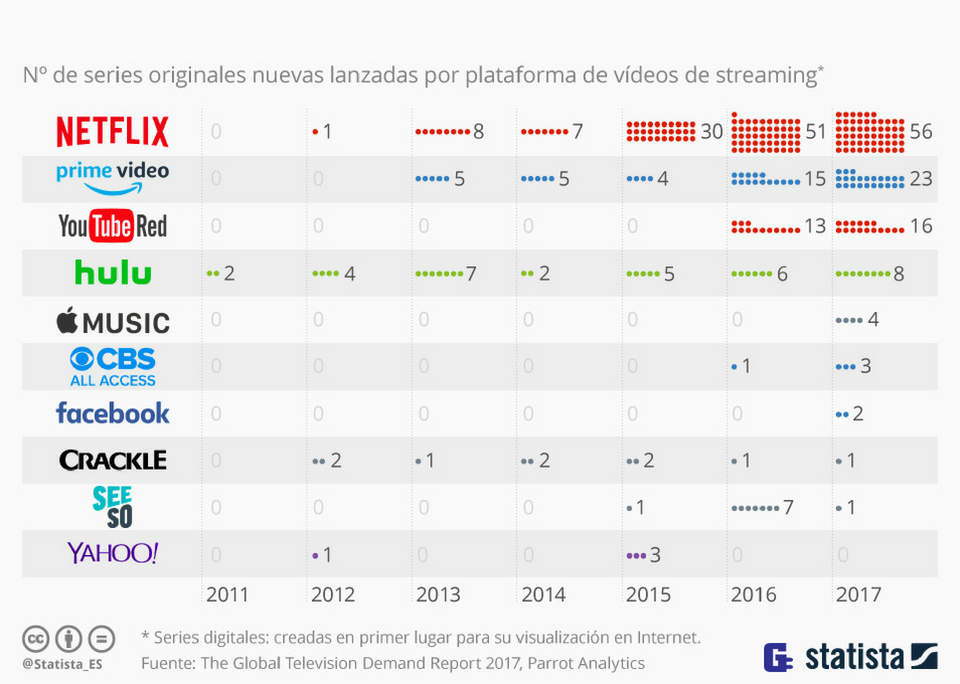 2017 finalizó con al menos 114 nuevas series producidas para su visualización en distintas plataformas digitales. De ellas, 56, lo que supondría un 49% del total, provenían de la casa Netflix. Esta cifra está en sintonía con la la evolución positiva en el número de estrenos en los últimos años. Tal y como muestra esta infografía de Statista, basada en estimaciones de la plataforma sobre la industria de la TV Parrot Analytics, en 2011 solo dos nuevos seriales fueron creados para su consumo online, número que alcanzó los 21 títulos en 2013 y los 94 en 2016.